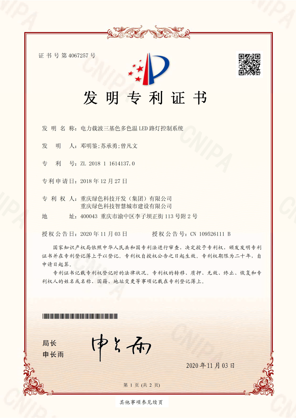 近日,重慶綠色科技開發(fā)(集團)有限公司再度喜獲一項國家發(fā)明專利《電力載波三基色多色溫LED路燈控制系統(tǒng)》(專利號:ZL 2018 1 1614137.0)。